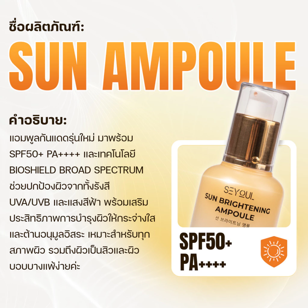 SEYOUL Sun Brightening Ampoule is a lightweight, fast-absorbing sun ampoule formulated to keep the skin protected, comfortable, and naturally radiant throughout the day. Designed with advanced HEV-shielding technology, it protects the skin from everyday exposure to blue light from digital screens while offering broad UV protection outdoors. The ultra-smooth ampoule texture feels like skincare—non-sticky, breathable, and ideal for hot and humid conditions. With brightening agents and moisture boosters, this sunscreen helps deliver a fresh, even-toned, glowing complexion without heaviness.
