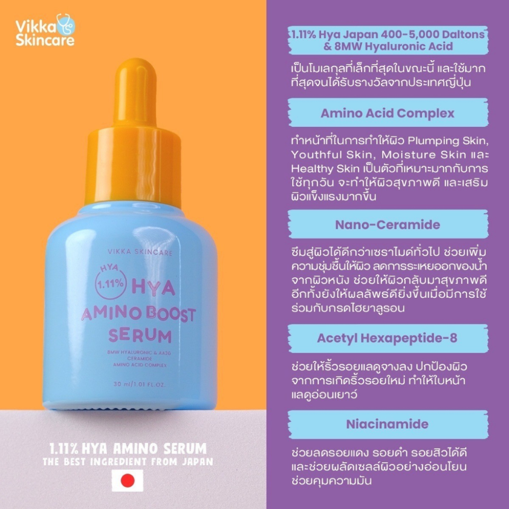 Vikka Skincare 1.11% Hya Amino Boost Serum (30ml) is an advanced hydrating and skin-repairing serum formulated for all skin types, including sensitive skin. Powered by 1.11% Hyaluronic Acid Complex and Amino Boost Technology, it delivers deep moisture, strengthens the skin barrier, and calms inflammation from within. This gentle yet powerful serum helps reduce redness, irritation, and enlarged pores while restoring balance and radiance to stressed or dehydrated skin. The lightweight texture absorbs quickly, leaving the skin smooth, supple, and refreshed.