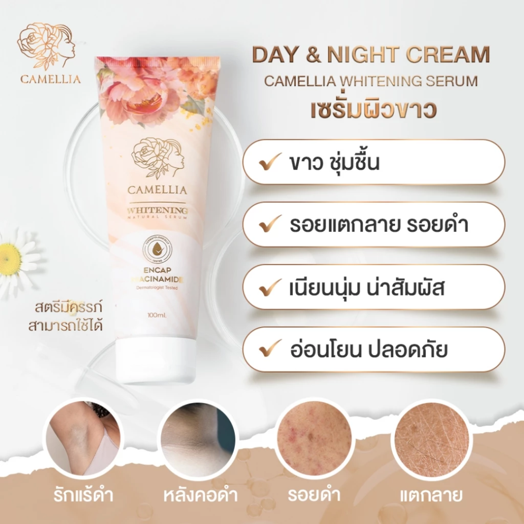 Experience soft, radiant skin with Camellia Whitening Natural Serum, a lightweight body serum infused with ENCAP Niacinamide technology for smooth and luminous skin. This gentle formula absorbs quickly without stickiness and helps improve skin texture for a softer, more even appearance. Packed with 13 botanical extracts, including Camellia Flower, Witch Hazel, and Centella, it provides deep hydration and care suitable for all skin types. Safe for sensitive skin, pregnant users, and children aged three and up.