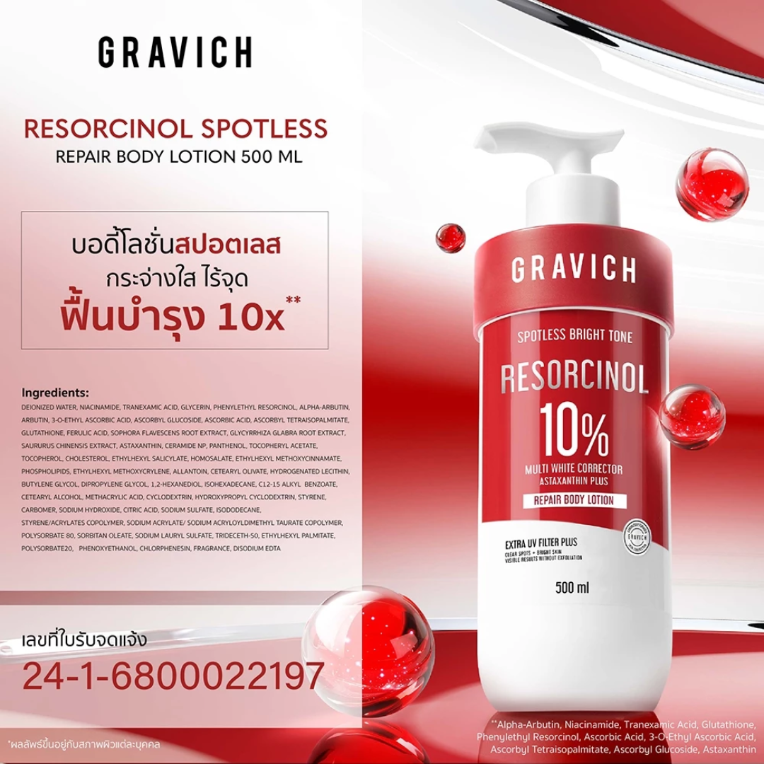 Gravich Resorcinol Spotless Repair Body Lotion 10% is an advanced bright-tone body lotion designed to improve dull, uneven-looking skin. Powered by Resorcinol 10% Multi White Corrector, Astaxanthin Plus, and Nanojet Encapsulation Technology, it delivers concentrated active ingredients deep into the skin for smoother, more luminous results. The lightweight “Light Cream Touch” texture absorbs quickly without residue, leaving your skin supple, soft, and hydrated.