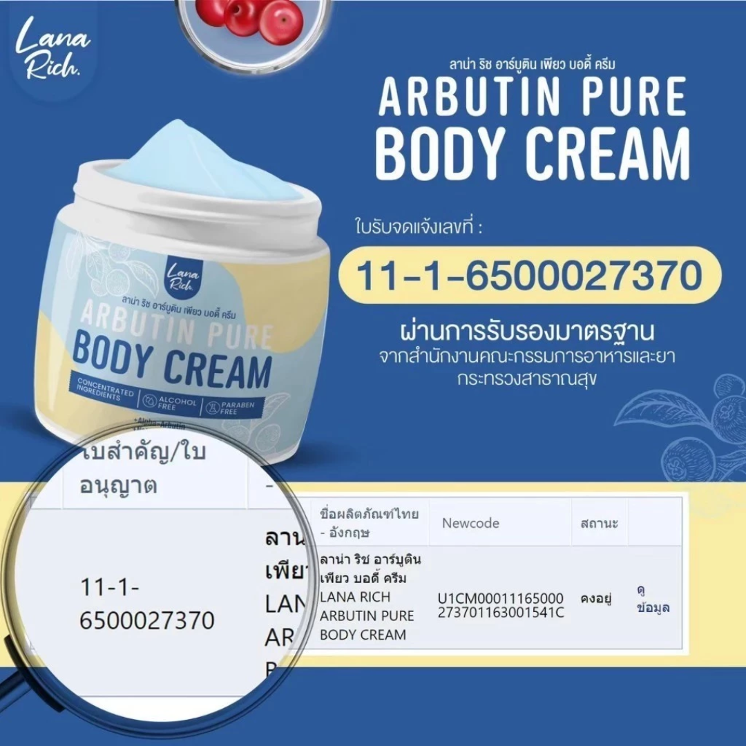 Reveal brighter, smoother, and more even-looking skin every day with Lana Rich Arbutin Pure Body Cream — your go-to formula for all-over radiance and softness.
