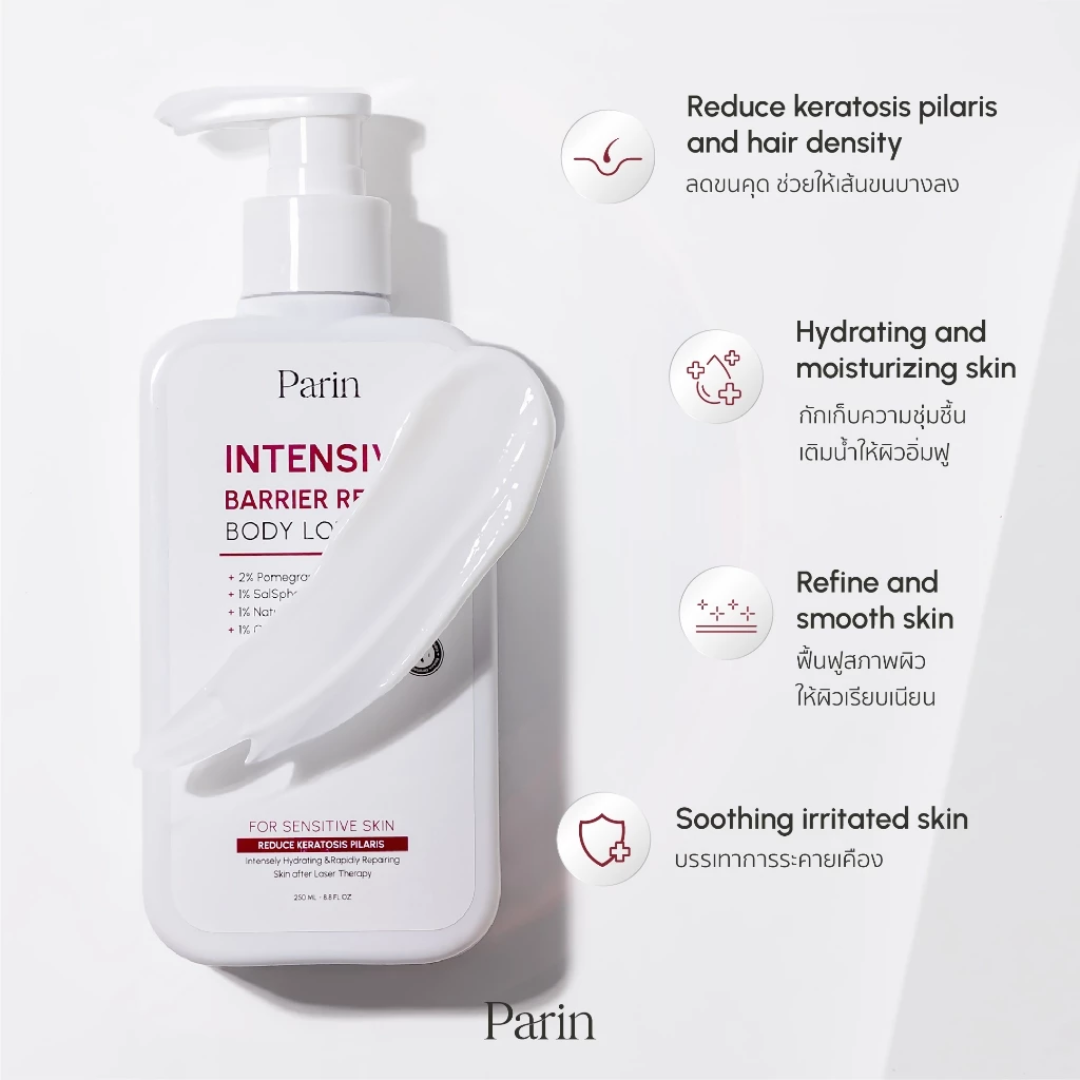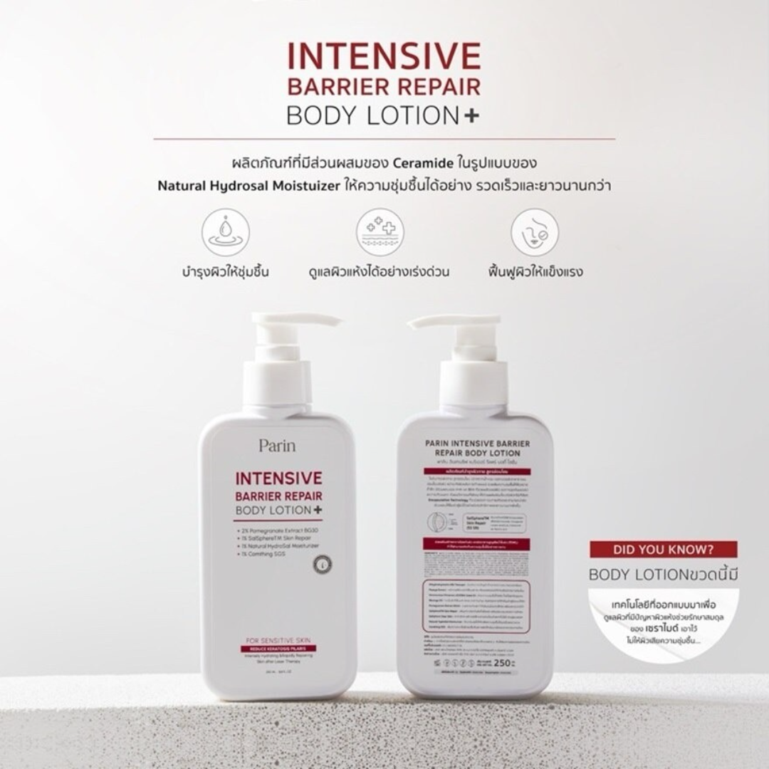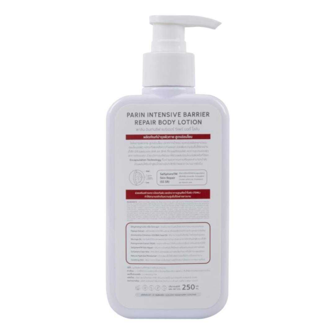 Parin Intensive Barrier Repair Body Lotion is a dermatologist-tested moisturizing body lotion developed for dry and sensitive skin. Infused with Ceramide complex, Pomegranate Extract BG30, and SalSphere™ Skin Repair Technology, it helps maintain skin hydration, reduce visible roughness, and restore a healthy skin barrier. Its non-greasy, fast-absorbing formula delivers long-lasting softness, leaving skin smooth and comfortable even after exposure to heat, sunlight, or pollution.