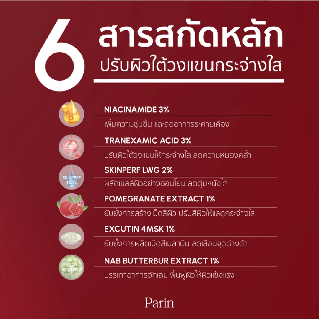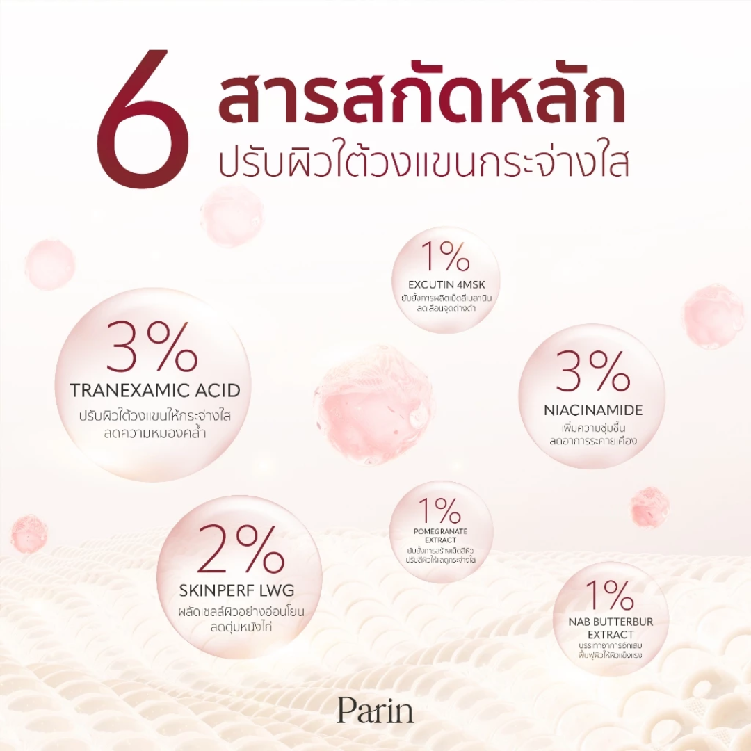 Parin Perfect White Repair Underarm Cream Plus is a lightweight, non-sticky underarm care cream developed to help restore smooth and clear skin. Enriched with active ingredients such as Niacinamide, Tranexamic Acid, and SkinPerf LWG, this cream works to refine texture, reduce dullness, and improve moisture balance under the arms. It’s dermatologist-tested for safety and suitable for all skin types — even sensitive skin and postpartum mothers.